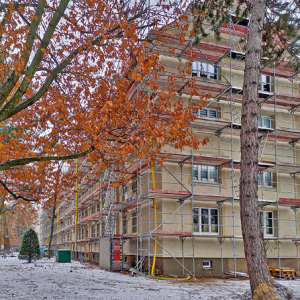 Einzelne Maßnahmen werden planmäßig erst nach Fertigstellung des Rohbaus der Dachgeschossaufstockung realisiert. Das umfasst insbesondere die Anbringung des Fassadenputzes inkl. des Endanstrichs, Anbringung der Sockeldämmung, Montage der Aufzugsanlagen sowie die maler- und bodenbelagsmäßige Instandsetzung der Treppenhäuser.